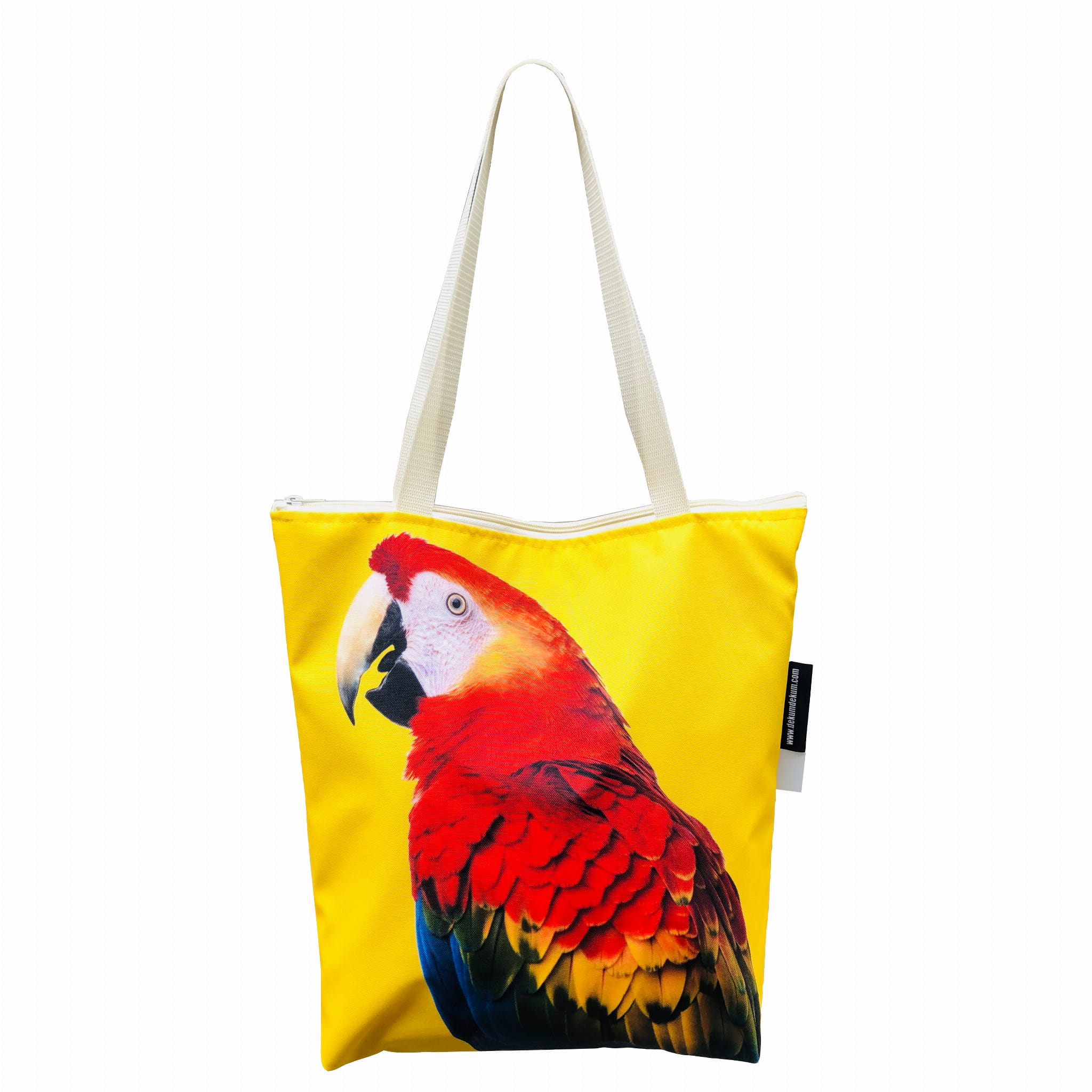 Klasyczna torba zakupowa DekumDekum z papugą na żółtym tle.