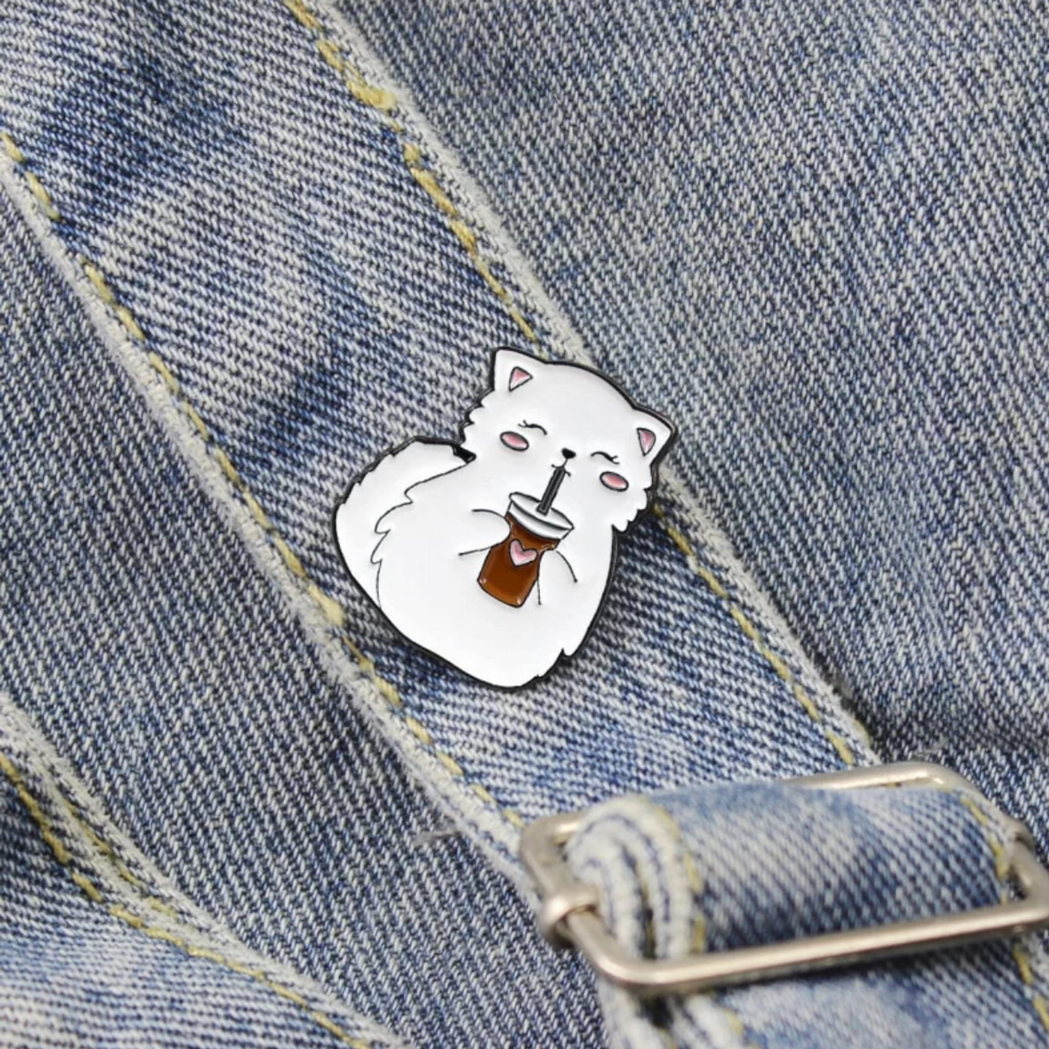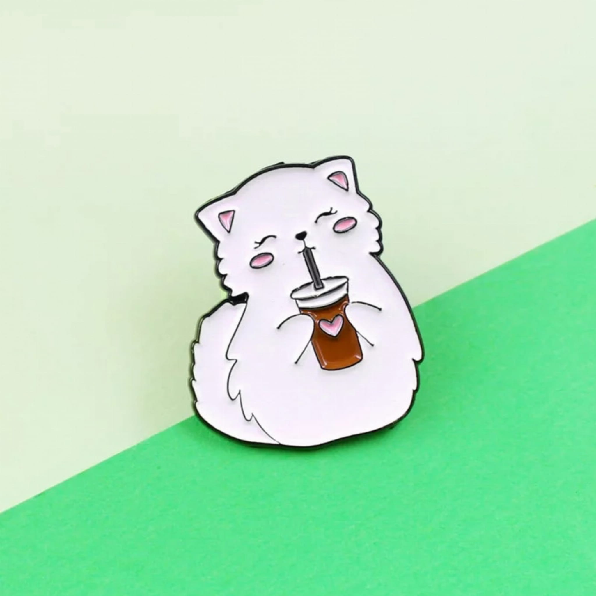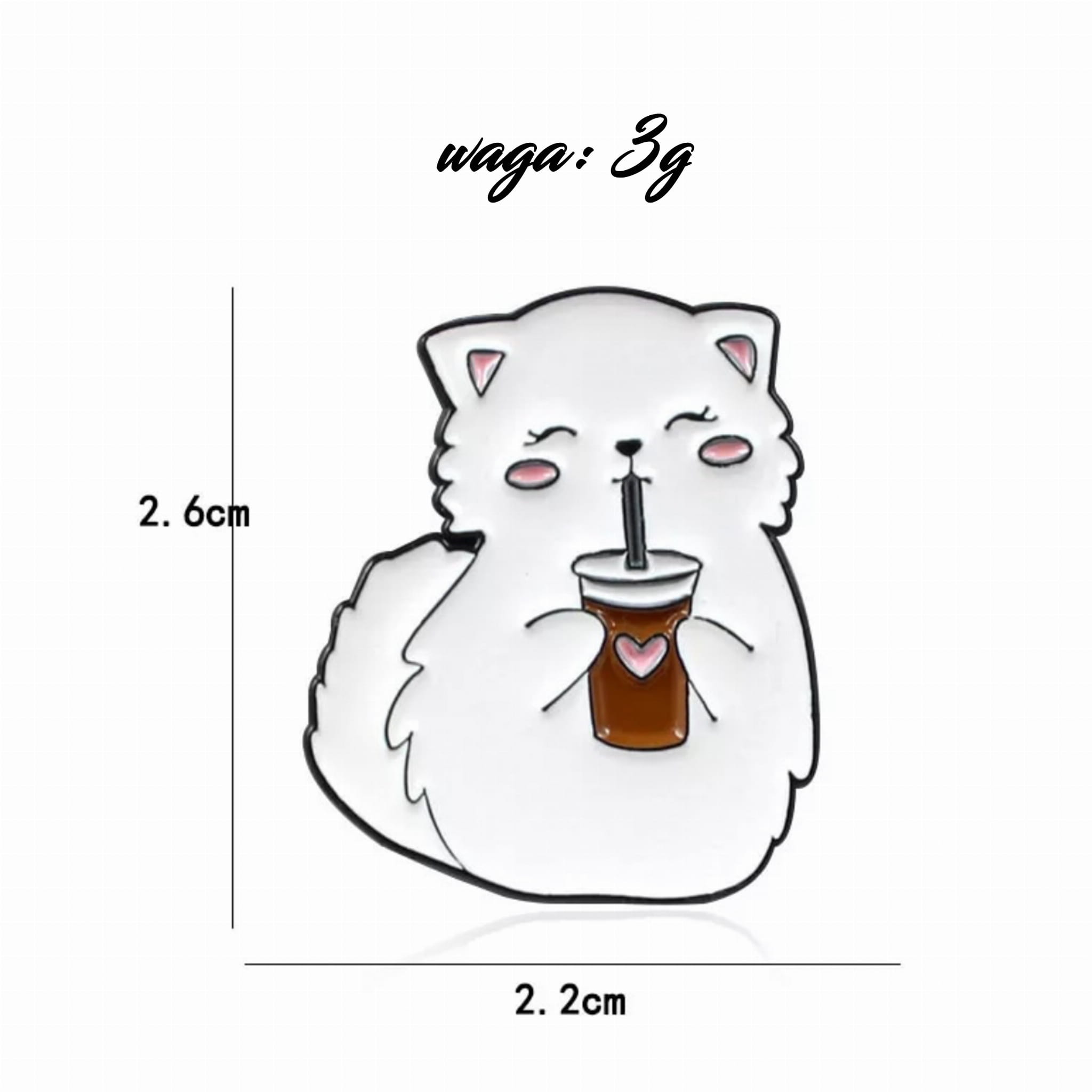 Przypinka PINS z białym kotkiem pijącym napój ze słomką.